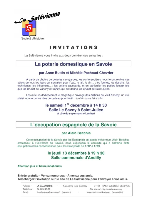 Chaque année, La Salévienne organise ou soutient plusieurs conférences, visites ou manifestations en rapport avec ses thèmes de recherche favoris. La plupart sont faites en Haute-Savoie, d'autres à Paris. Retrouvez ci-dessous l'annonce des prochains événements ainsi que la liste des manifestations passées. Si un compte-rendu a été rédigé, la référence vers le Benon correspondant est indiquée.