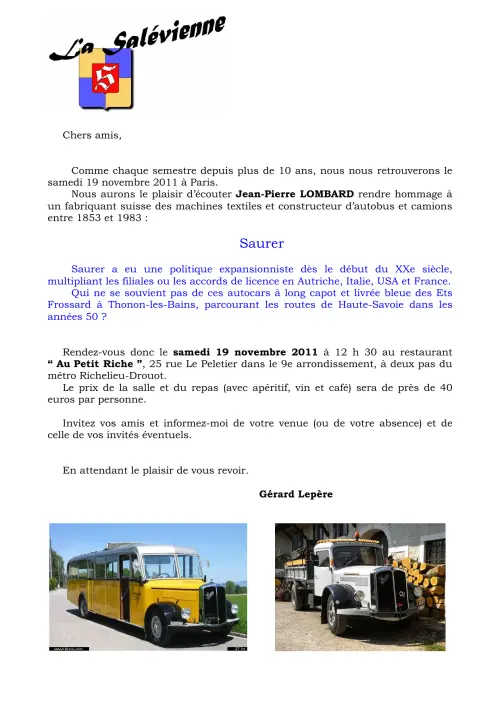 Plus d'infos...Benon n°75Conférence : Saurer (fabriquant suisse des machines textiles et constructeur d’autobus et camions)