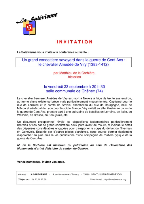 Plus d'infos...Benon n°75Conférence : Un grand condottiere savoyard dans la guerre de Cent Ans : le chevalier Amédée de Viry (1383-1412)