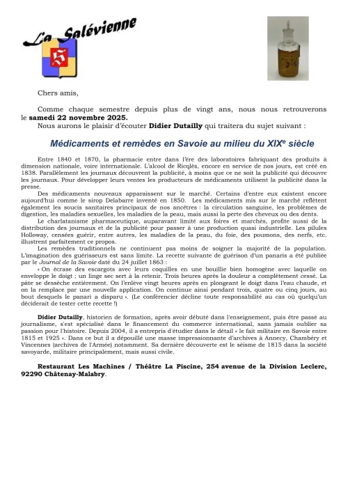 Plus d'infos...Benon n°124Conférence : Médicaments et remèdes en Savoie au milieu du XIXe siècle