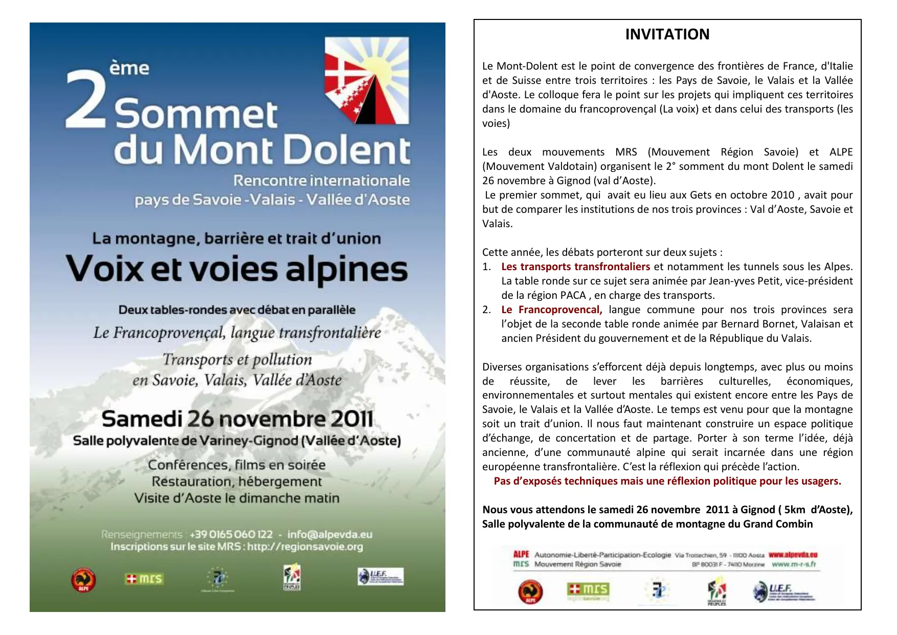Conférence : 2ème Sommet du Mont Dolent : La montagne, barrière et trait d'union, Voix et voies alpines, organisée par La Salévienne